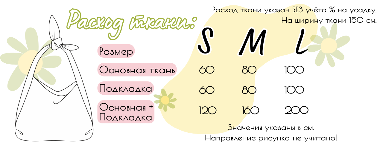 Если вы хотите сшить весь шоппер из одной ткани, то необходимо ориентироваться на расход ткани: основная + подкладка, а если подкладка и основная ткань у вас разные, то в таблице расхода ткани вы найдёте отдельные значения для расхода ткани верха и подкладки.