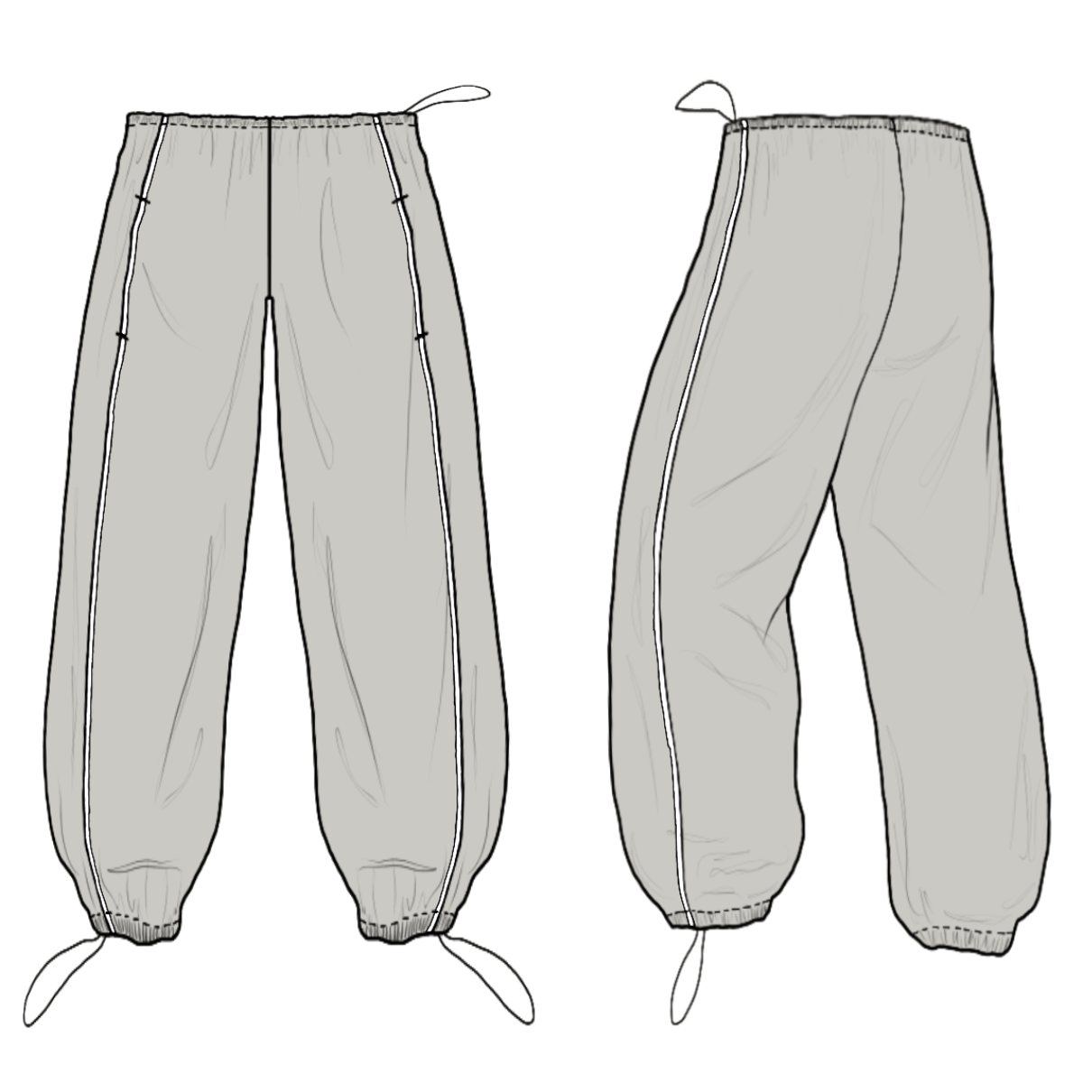 Низ брюк обработан цельнокроеной кулиской и регулируется с помощью шляпной резинки и фиксатора.
