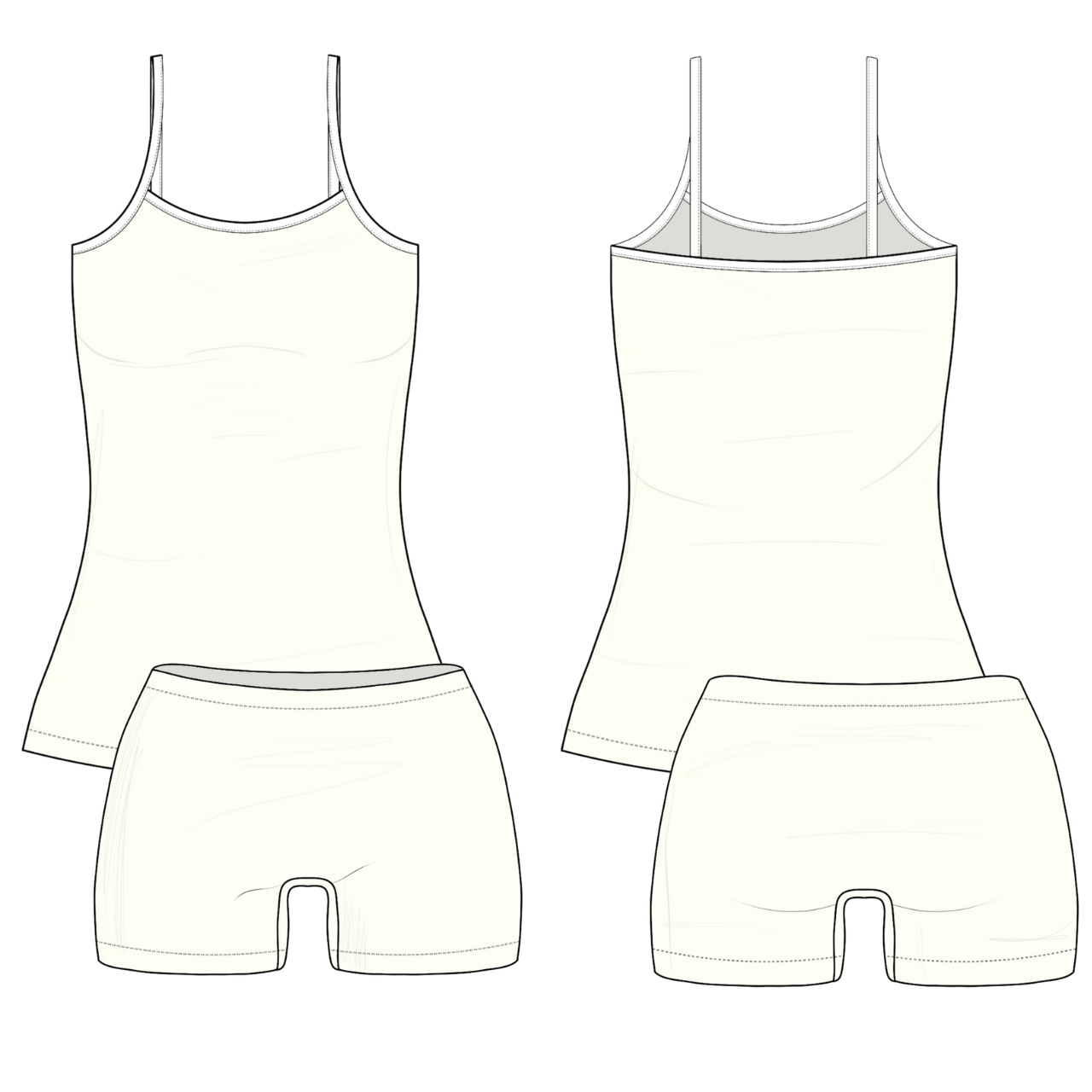 Майка прилегающего силуэта. Верхний срез окантован бейкой из основной ткани, пройма и верхний срез спинки окантованы бейкой из основной ткани, которая перетекает в бретель. Бретели регулируются по длине с помощью бельевых регуляторов. Шорты прилегающего силуэта с ластовицей по шаговому шву.