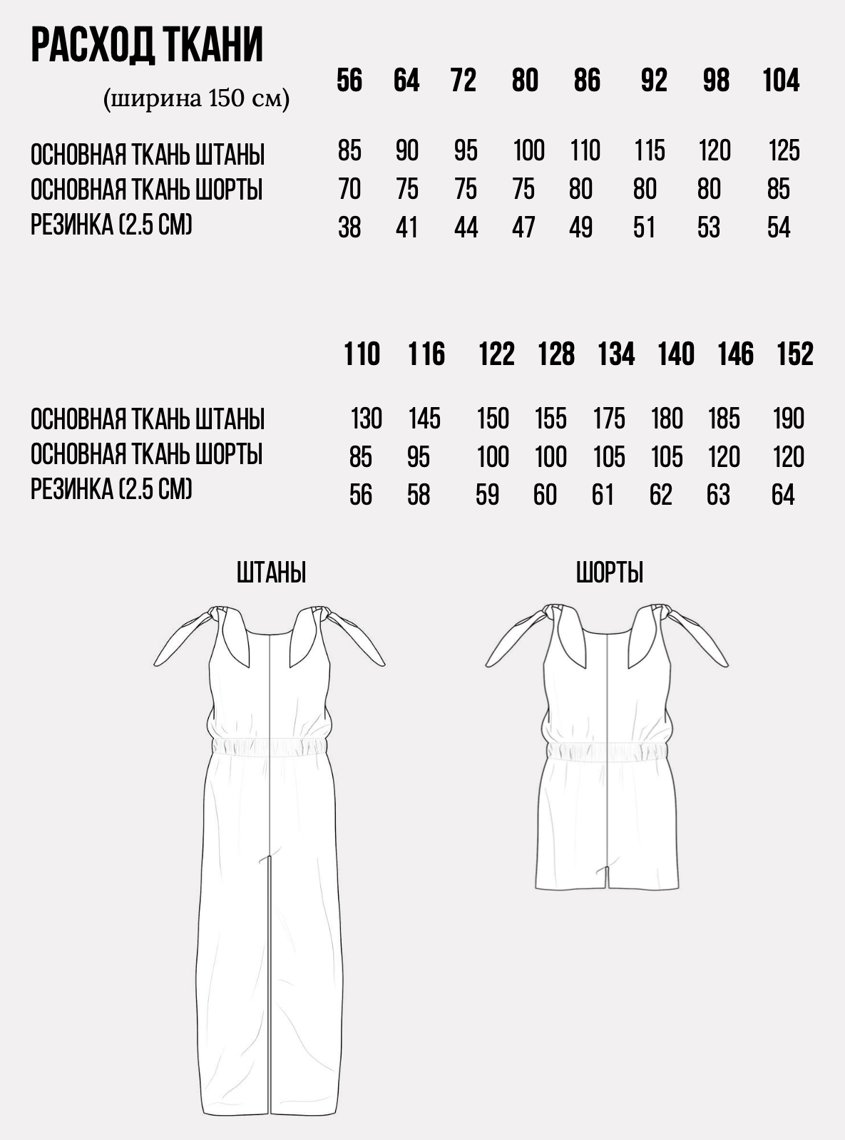 - комбинезон прямого силуэта, без боковых швов. В выкройке предложено 2 варианта длины: шорты и штаны.