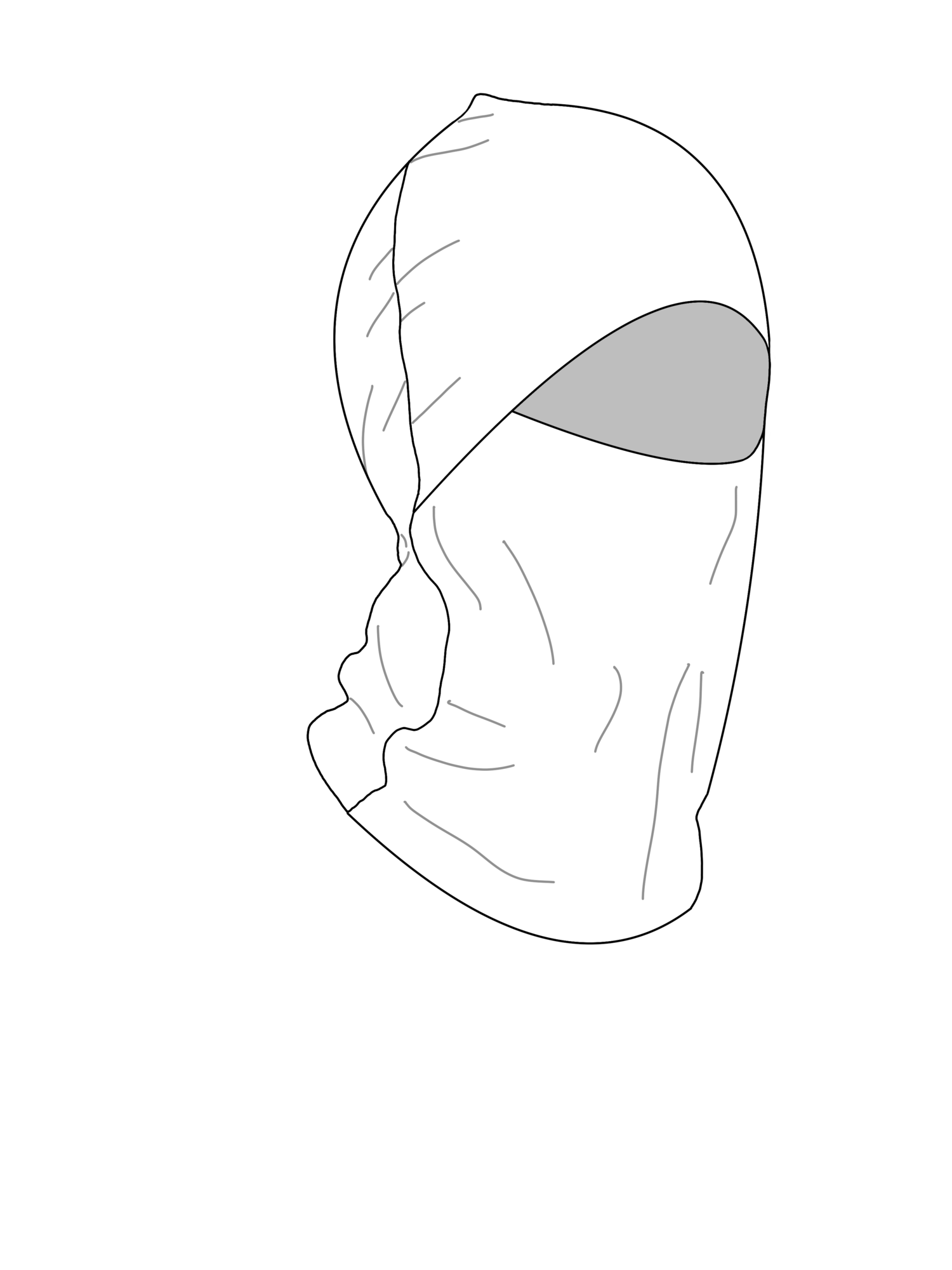 - шапка-маска, с фигурным разрезом по передней части. Передняя часть делится на верхнюю и нижнюю, благодаря этому образуется фигурный вырез для глаз. Нижнюю часть так же можно опустить до подбородка. Выкройка рассчитана на трикотажные полотна с коэф. эластичности 0.7-0.8. В случае если полотно менее эластично рекомендую печатать выкройку в большем масштабе.