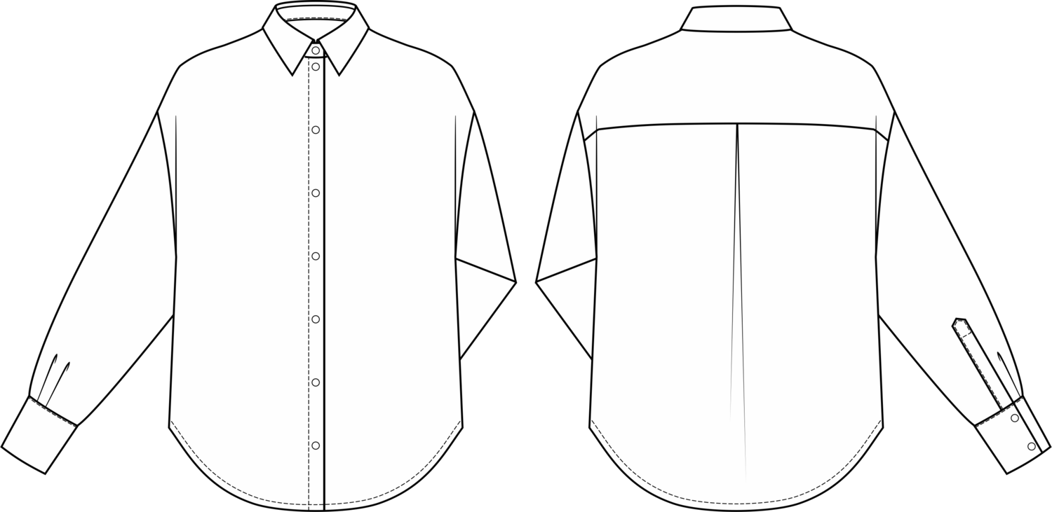 Рубашка оверсайз, прямого силуэта с фигурной линией низа. Длина сзади больше, чем спереди. Низ обработан в подгибку.