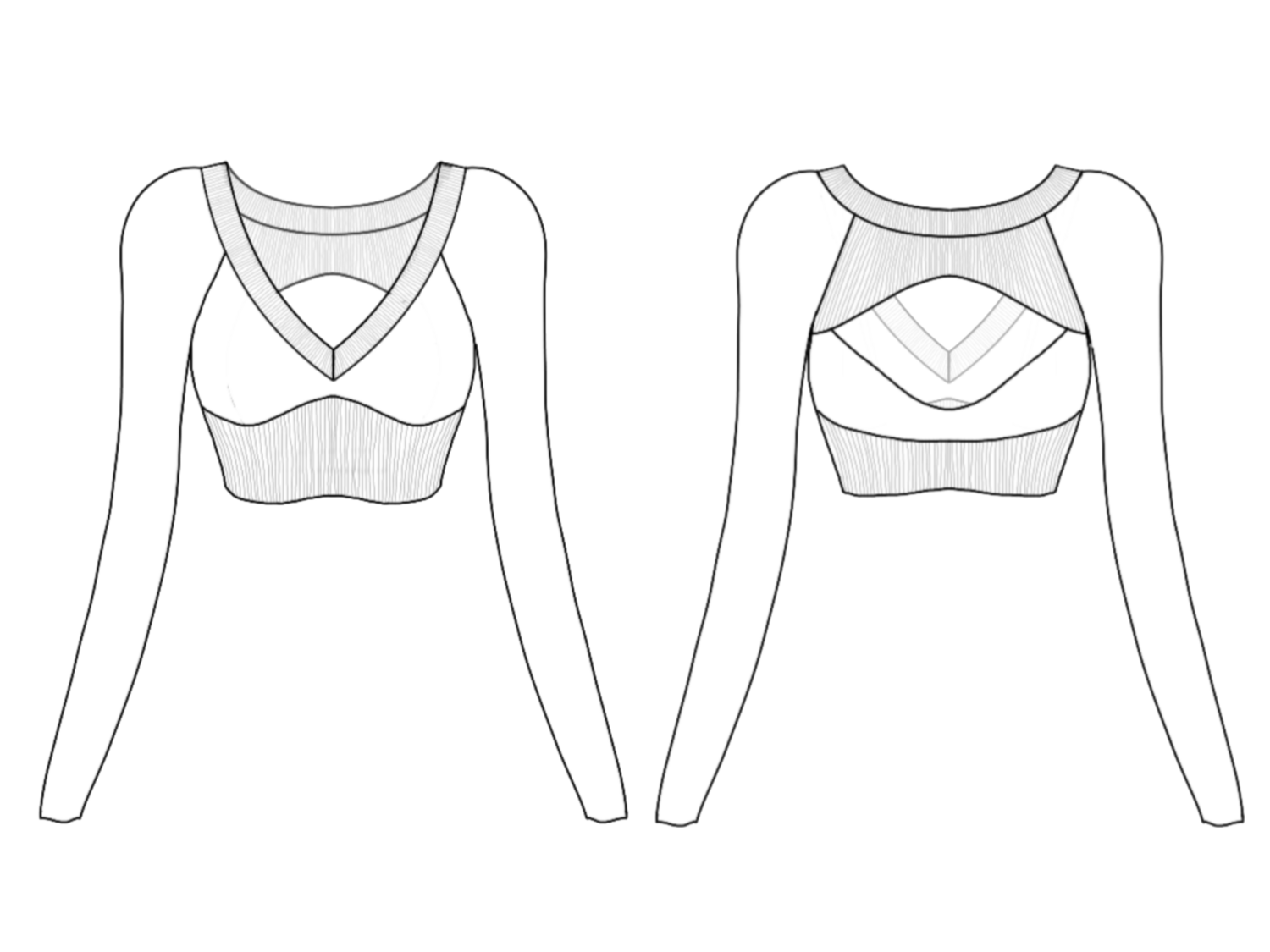 Спинка состоит из верхней и нижней части, края деталей формируют фигурный вырез. Верхняя часть спинки выкроена из кашкорсе, чтобы обеспечить лучшее прилегание в области лопаток.