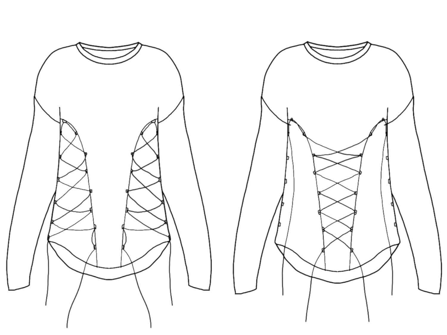 По переду рельефные швы, в рельефных и боковых швах расположены петли. В петли вдет шнурок, который имитирует шнуровку и позволяет регулировать свободу облегания.