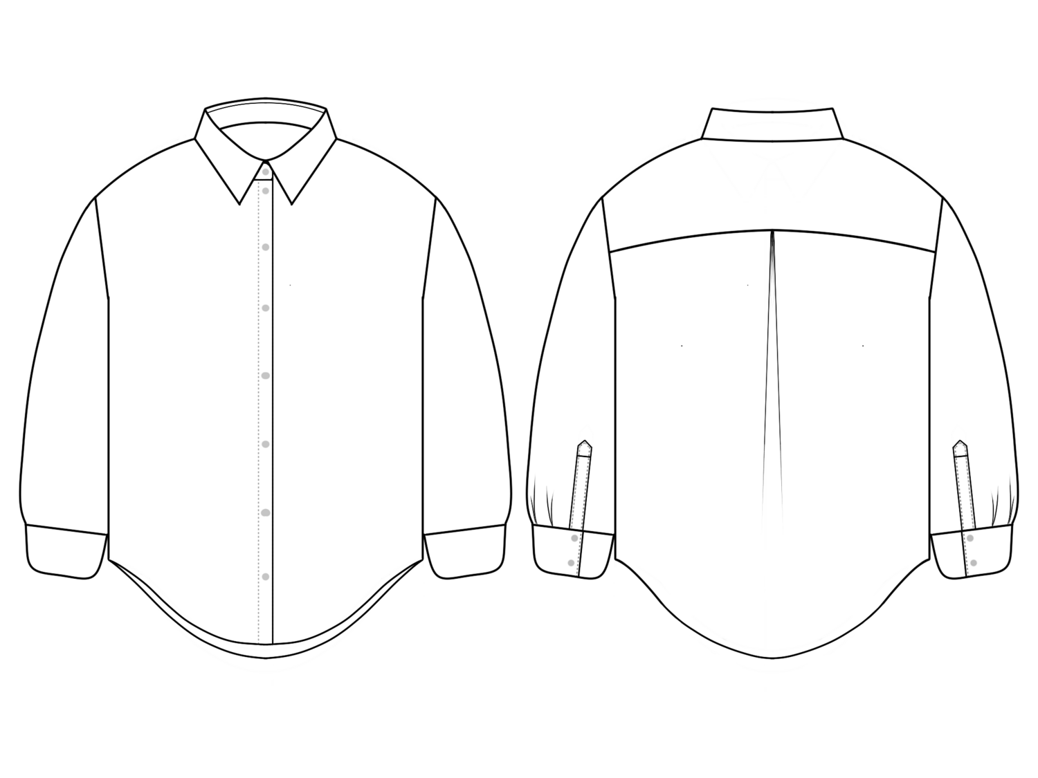 - Рубашка оверсайз, прямого силуэта с фигурной линией низа. Длина сзади больше, чем спереди.